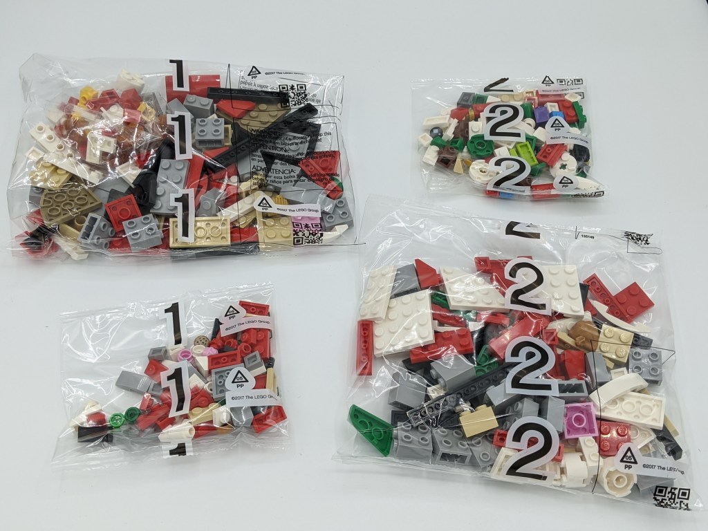 Five bags are included in the box. (The larger bag 1 has a bag within the bag.) Mrs. Claus is built from bag 1 while Mr. Claus is built from bag 2. It should be no surprise that white and red are the main colors of the set, with some green mixed in, the standard grey studs-not-on-top bricks (sorry AFOLs, I just can’t bring myself to say it) to form the headz, and other assorted colors like tan and black, and of course the traditional pink 2 x 2 bricks for the brains. Overall it makes for a very colorful package.