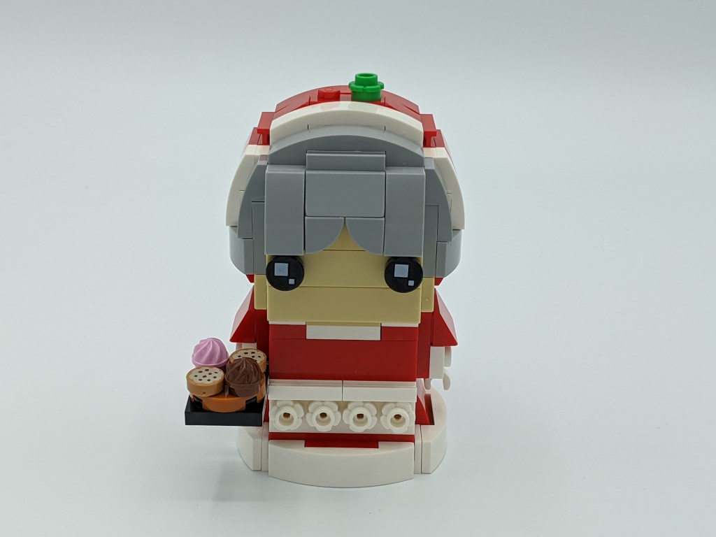 My wife built Mrs. Claus for the family tonight. It’s the more advanced build of the two, or at least the most different from the standard BrickHeadz design, mainly due to her dress. She’s wearing a white apron over her red dress, presumably since she just made some cookies and cupcakes, and she has a red hood with white trim over her gray hair.