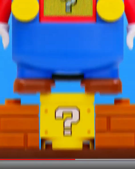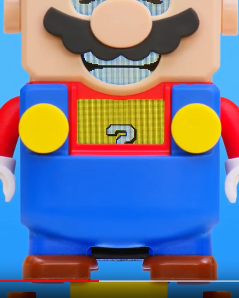 The video starts with a close up of a Mario figure. He doesn’t look very LEGO-like at first. He has what appears to be a video screen on his chest where a slot machine is spinning a very familiar question mark icon, with a very familiar ringing sound. Mario’s eyes and mouth have that same video screen quality.