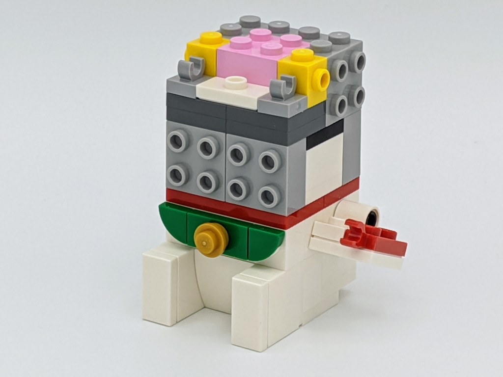 The finished assembly of the ears is cleverly accomplished using red 1 x 1 bricks with handles plus white 1 x 2 curved slopes and white 1 x 2 inverted curved slopes. The rest of Lucky Cat’s head is a simple assembly of additional white curved slopes.